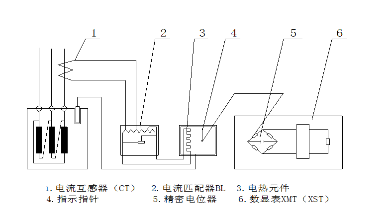 2、當變壓器帶負荷時,此時繞溫高於(yú)油溫,繞溫計除瞭(le)通過溫包測量油溫外,還需要接入變壓器套管CT,通過取得與負荷成正比的電流,然後經過電流匹配器調整後,在電熱元件上産生熱量,使指示指針偏移,近似得到繞組對油的溫升,再加上頂層油溫,所得溫度即爲繞組的溫度,原理圖: