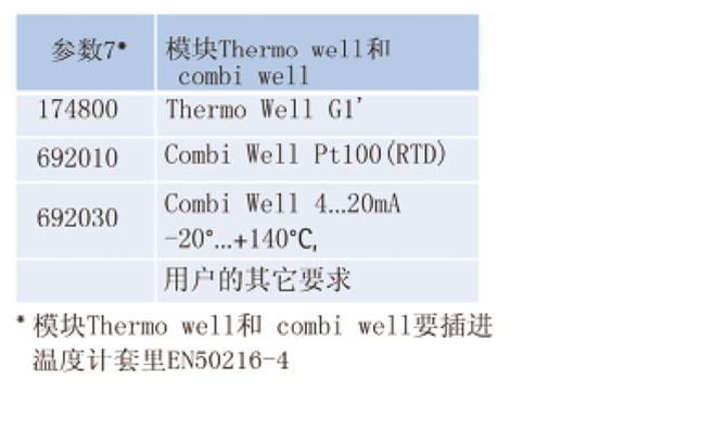 複合傳感器模塊是油溫計的安裝用的模塊可以被安裝在DIN 42554溫度計封套中還備有一符合DIN 43760的測量電阻Pt100,這樣可實現溫值遠傳。複合傳感器模塊由潛管和接頭組成。在接頭處有連接到遠端設備(例如:數碼顯示器)的接線端子以及連接到潛管的用於指針溫度計的溫度傳感器的端子。